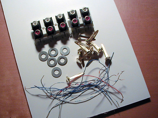 The ring of 8 pins on the base are connected to the tip of the individual phono jacks with hookup wire. Another piece of wire is connected to a washer, and then to a common (ground) point on the phono jacks.