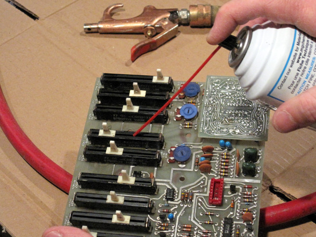 While repairing the synth section of an Arp Omni, it occured to me that the circuit board with the faders would make a good case study for cleaning pots. The faders were all similar in construction, had the same exposure to dirt and grime, and it was apparent that they had never been cleaned before.