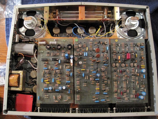 The capacitors, transistors, and power resistors were also upgraded to run cooler. The most obvious changes are the 5 Watt resistors (white ceramic blocks) replacing the green 3 Watt resistors.